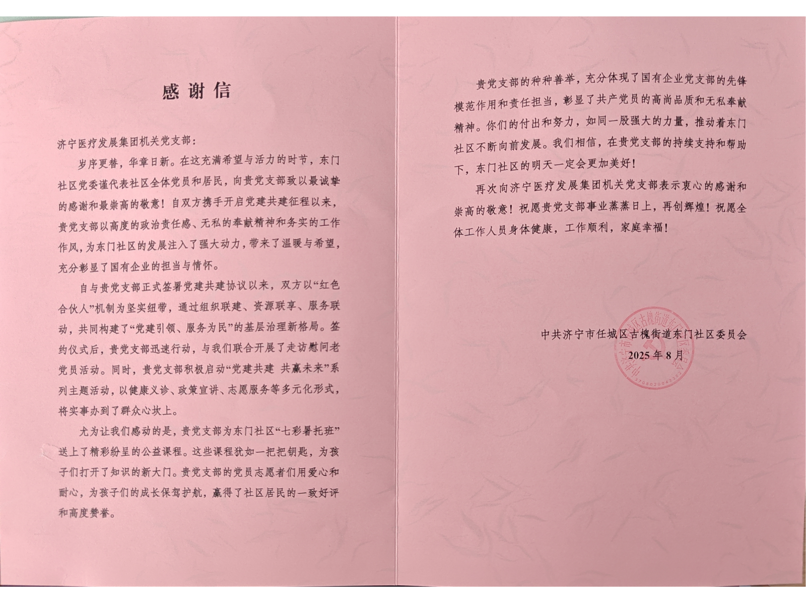 “真是太感谢你们了,咱们党建联建单位情意浓,暑假里多亏有了你们的支持,我们社区的七彩暑假班开展得丰富多彩,孩子和家长都很认可。”8月28日,古槐街道社区工作人员将一封感谢信送到了医疗发展集团,并表达了感谢之情。